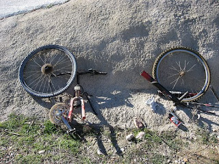 Downhill test Shortly after the photo was taken I lost my bottle. I could feel that one brand new (with probably slightly oily disk) brake wasn't going to stop us. Rear derailleurs, ugh! Mounting them is a pain. Only a couple of weeks ago - really far down the road in the project - I actually thought about how to mount the rear derailleurs. In the Kyoto Cruiser plans, Brad used a couple of 'old school' rear derailleurs that mount on the rear axle. These have their downside in that the ideal mounting point is in the middle of the axle (which is definitely not desirable for KC). But their plus side is that all you need is an axle-diameter bolt to attach to the spur that you weld to the frame.